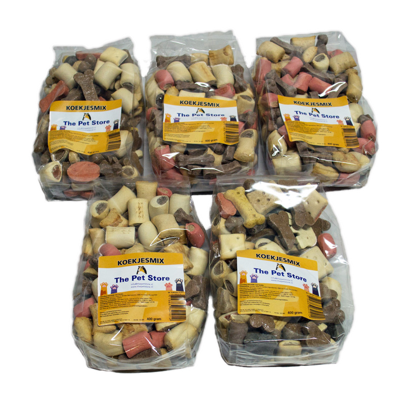 Variatie is het kruid van het hondenleven. Kan jouw hond ook nooit kiezen? Met deze gevarieerde koekjesmix is elk tussendoortje weer een verrassing. De knapperige textuur helpt bij het verzorgen van het gebit, terwijl de verschillende smaken zorgen voor een blije staart. Met deze voordeelverpakking van 2 kilo (5 x 400g) heb je altijd de ideale snack voor in de koekjestrommel.